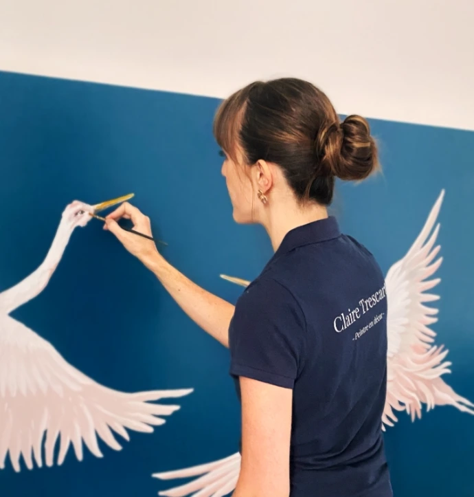 On y voit le geste précis de la peinture, les détails des plumes et la recherche de mouvement et de légèreté. Ce type de fresque apporte poésie, sérénité et une touche naturelle à l'espace.