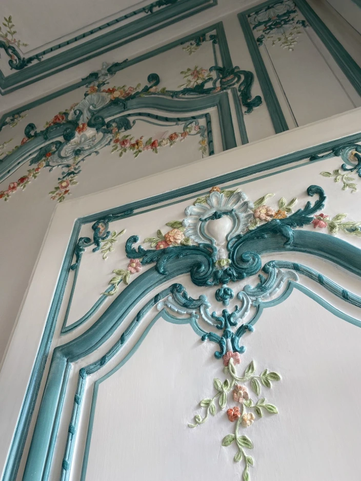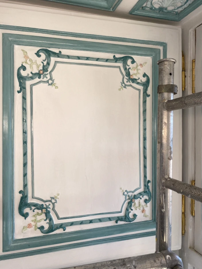 Sur place, j'ai réalisé des interventions de restitutions des peintures à l'huile sur l'ensemble des boiseries et ornements de cette pièce (moulures, ornements floraux, puttis).