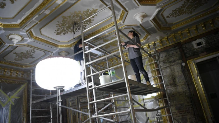 Avec l'échafaudage, on mesure l'ampleur du travail : rebouchage des fissures, reprises des fonds, application de feuille d'or et harmonisation des teintes.