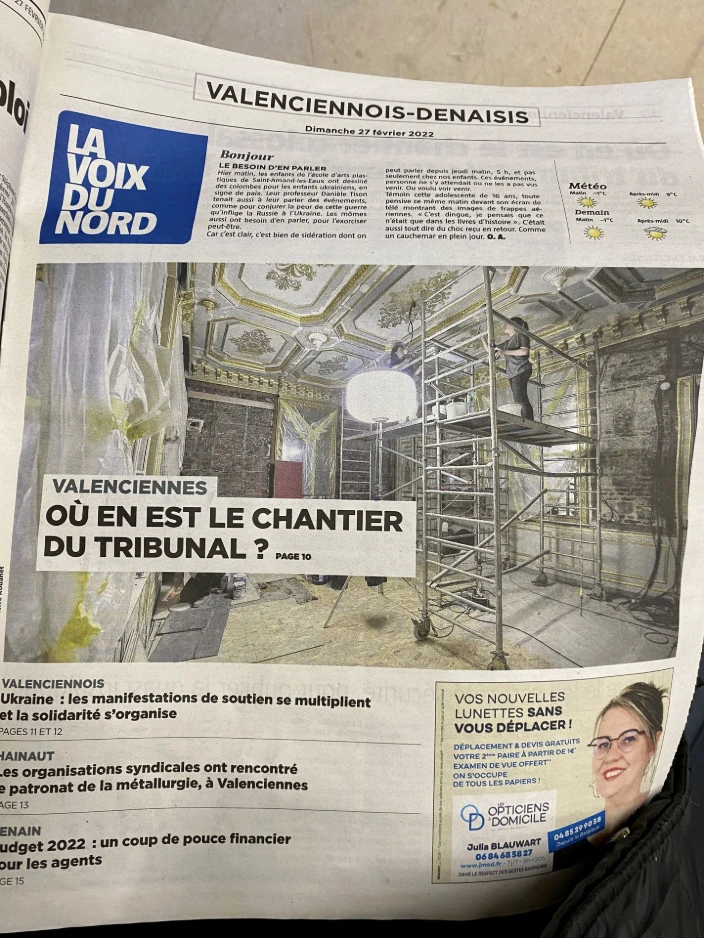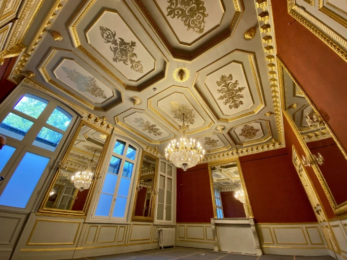Sur ce magnifique chantier du Tribunal Judiciaire de Valenciennes, j'interviens sur un plafond à caissons orné de motifs dorés (fleurs, volutes, rosaces) sur un fond gris clair.