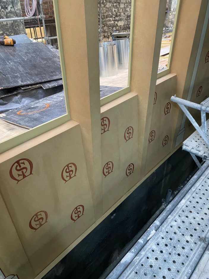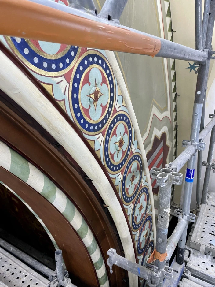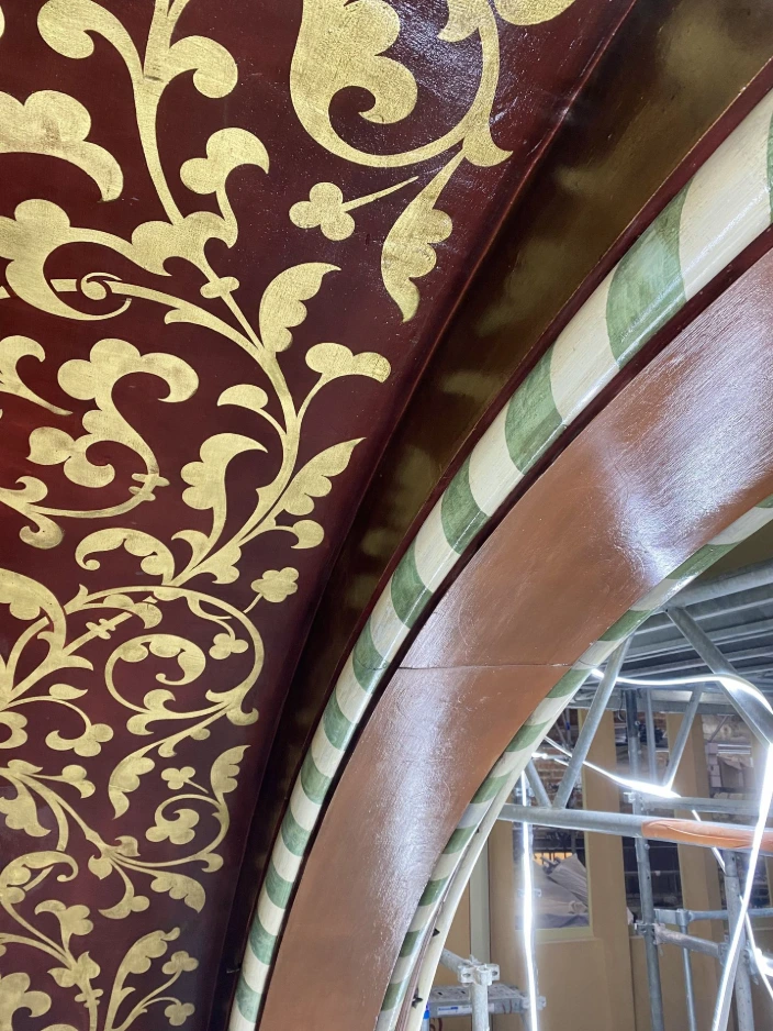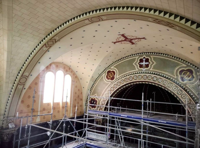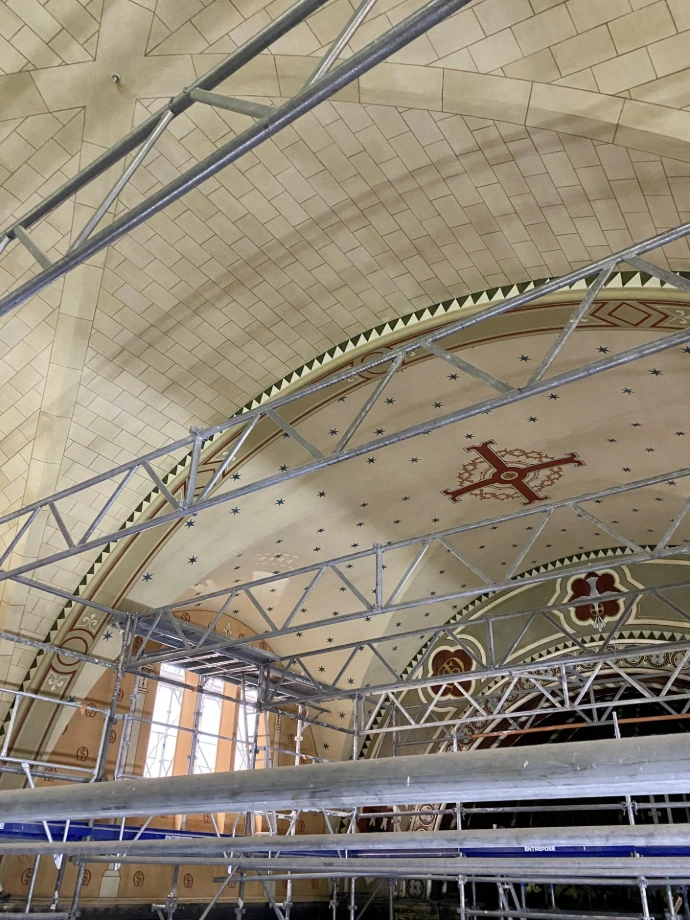 Sur ce chantier patrimonial, le projet inclut la restitution de décors (motifs répétitifs), reprise des dorures et l'imitation de pierre sur l'ensemble des voûtes.