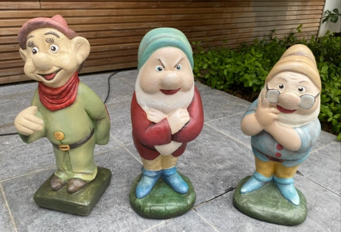 Ces trois statuettes de collection (nain de jardin en pierre italienne) avaient bien vécu : peinture écaillée, mousse incrustée, couleurs ternes... Ils avaient perdu tout leur charme.