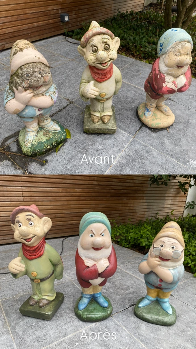 Résultat : ils ont retrouvé leur sourire malicieux et leur place de choix dans le jardin ! Une intervention qui montre que même les petits éléments décoratifs méritent attention et savoir-faire.